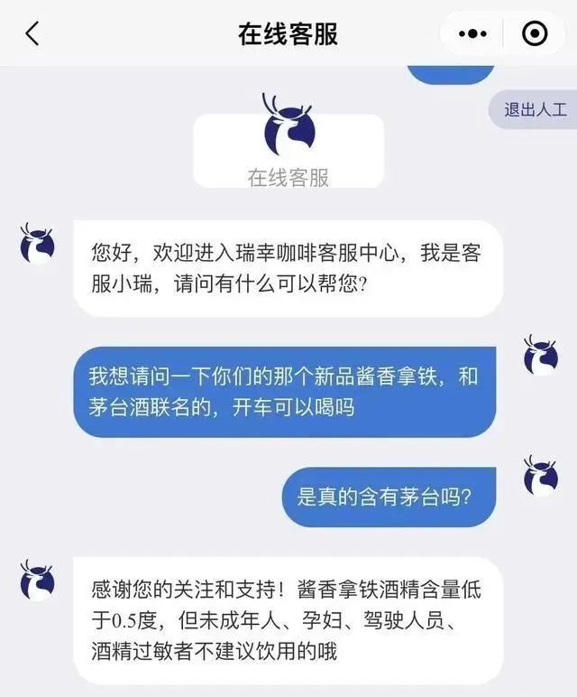 对于饮品内含有酒精,瑞幸官方小程序客服回应称:酱香拿铁酒精含量低于0.5度,但未成年人、孕妇、驾驶人员、酒精过敏者不建议饮用。