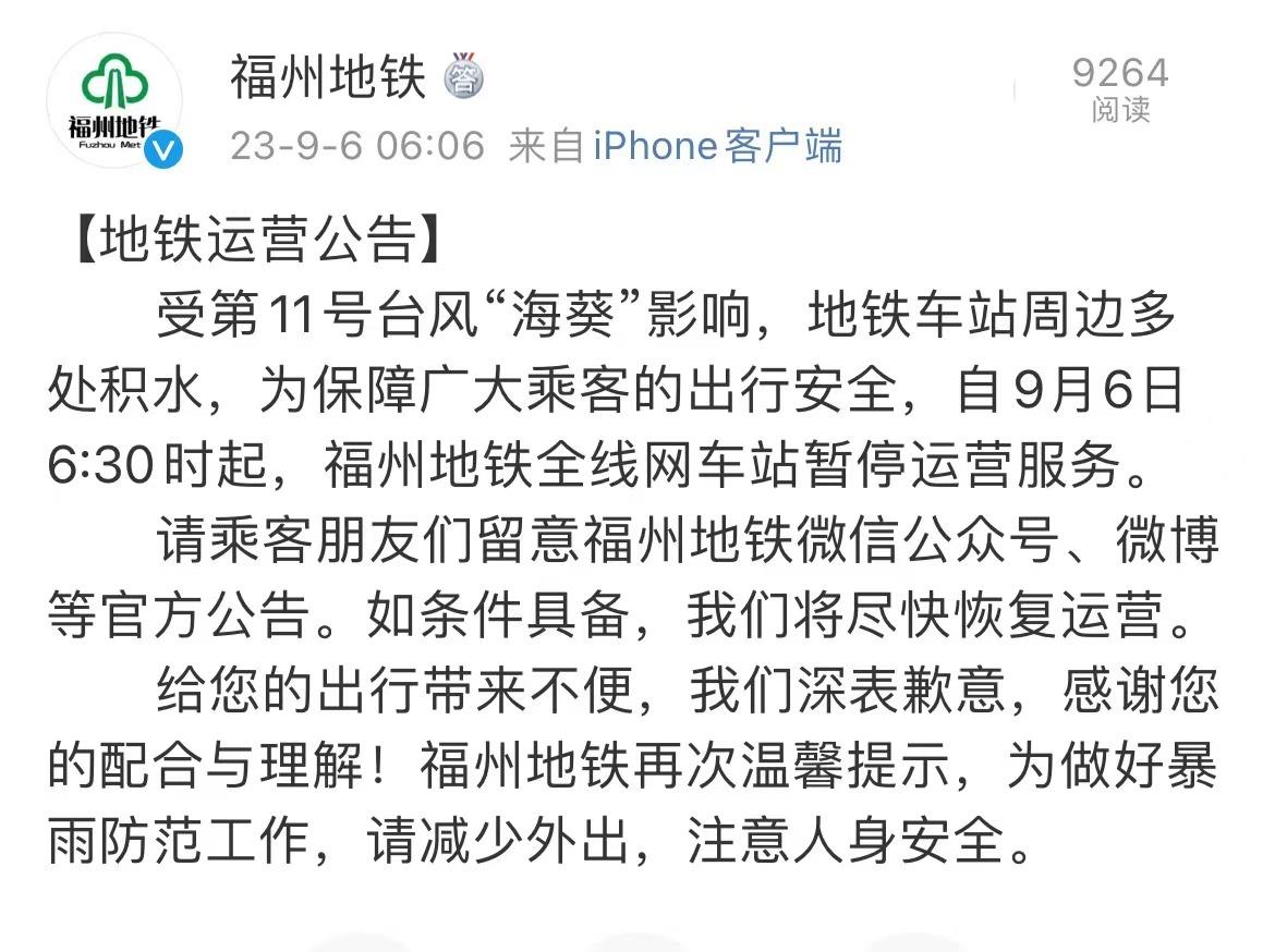 福州地铁6日发布公告,受第11号台风“海葵”影响,地铁车站周边多处积水,为保障广大乘客的出行安全,自9月6日6时30分起,福州地铁全线网车站暂停运营服务。