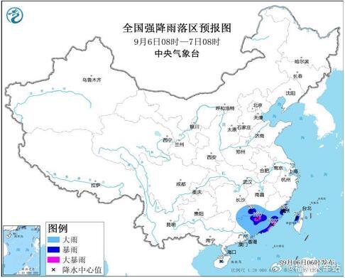 中央气象台9月6日6时继续发布暴雨黄色预警,预计至9月6日20时福建东部和南部、广东东部、江西南部、浙江东南部等地部分地区有大到暴雨。