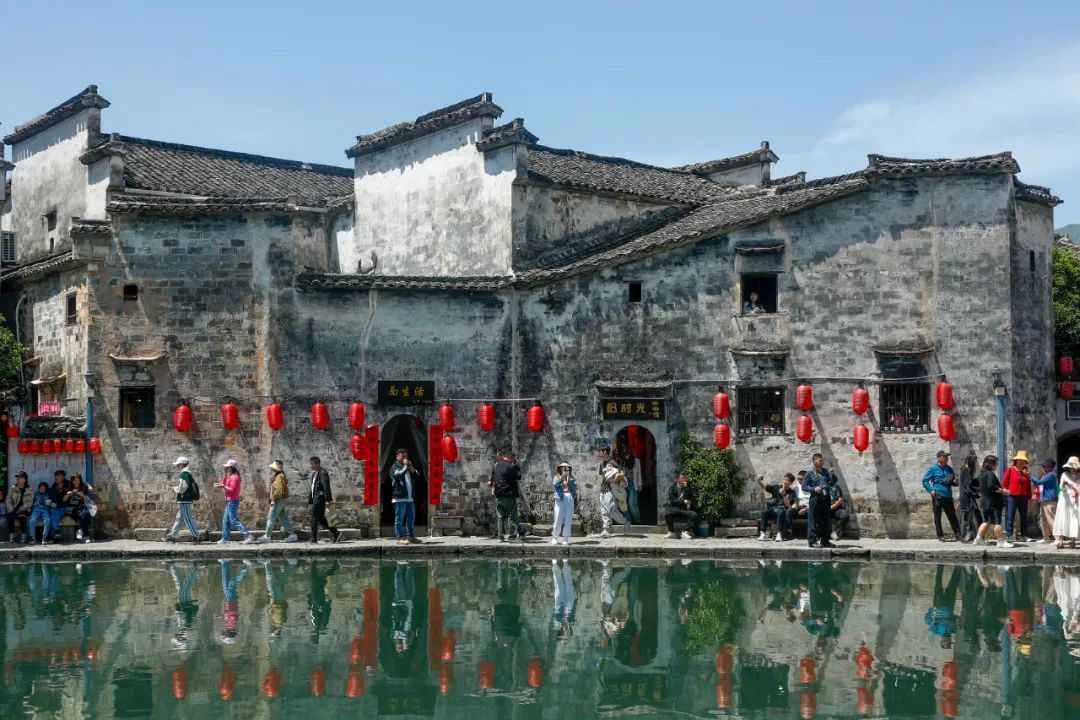 在西递,庄重古朴的明清建筑群内,通过抛绣球选佳婿的形式,再现徽州婚俗文化场景;夜幕降临,以喷泉为幕布,水幕演艺秀《西递传奇》通过声、光、电等现代科技手段,讲述西递故事,赋予游客沉浸式体验。在宏村,游客可以身着汉服与“NPC”挑战诗词对答;以徽州女人“阿菊”为主角的大型实景演出《宏村·阿菊》重磅回归,带领观众开启一段充满梦幻与诗意的徽文化之旅。夜色朦胧,月沼两旁悬挂的灯笼亮起,粉墙黛瓦的徽派建筑在灯光的映衬下倒映在湖面,让众多游客沉醉于夜色中的古徽州之美。近年来,宏村围绕“古村夜韵”品牌,大力发展精品民宿、特色酒吧、网红餐厅等时尚业态,将夜经济与文旅产业深度融合,上榜第二批国家级夜间文化和旅游消费集聚区。