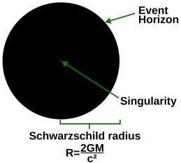 史瓦西度规的表达式在两个地方成为无穷大,一处为半径为零处,另一处为半径等于2GM/c2处。后者被称为“史瓦西半径”、“引力半径”或球对称静止不带电天体的“事件视界”。此处的无穷大可以通过采用其他坐标来消除。不过,半径为零处的无穷大无法被消除,如果物质浓缩到这个点上,其密度就是无穷大,这就是“奇点”。(用后来被发展出来的时空几何学的语言描述就是:测地线在奇点处断裂。)