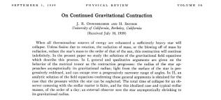 同年,奥本海默与其博士研究生斯奈德(Hartland Snyder,1913-1962)以奥本海默与沃尔科夫不久前的论文为基础,用广义相对论研究了质量超过TOV极限的恒星的收缩,与9月1日发表了论文《论持续引力收缩》(On Continuing Gravitational Contraction)。