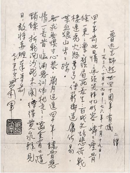 萧军为“鲁迅逝世四十周年”所题律诗手稿在《纽约邮报》上,一名档案馆管理员分享了阅读手稿的乐趣:“作为一名档案管理员,当我处理新获得的个人文件时,让我特别高兴的一件事就是看到信封里的一堆手写信件。这些信件可能自从信封最初被打开以来就没有被阅读过。我不知道他们说了什么,也不知道他们讲的故事,直到我把它们从信封里拿出来展开。接下来,就是在探索中收获快乐。”