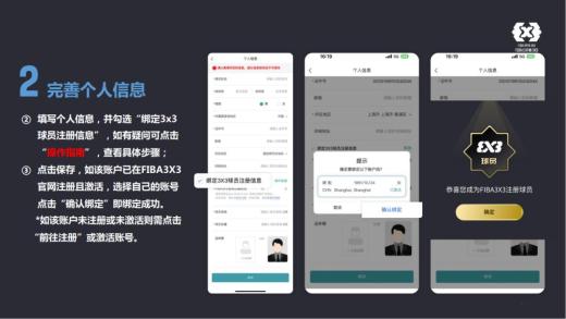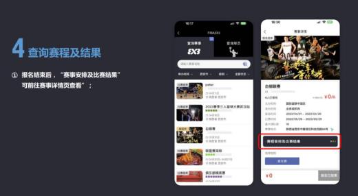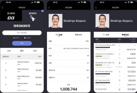 球员可通过"FIBA篮球”APP注册球员信息进行赛事报名。赛事结束后,根据姓名、国籍进行筛选查询自己的排名,点击球员信息还可查看球员个人信息以及参加过的赛事成绩、积分情况。球员在APP报名参加的每场赛事均会实时更新积分,积分累积可以帮助球员晋级到更高层级的比赛,更有机会与来自世界各地的三人篮球高手同场竞技。