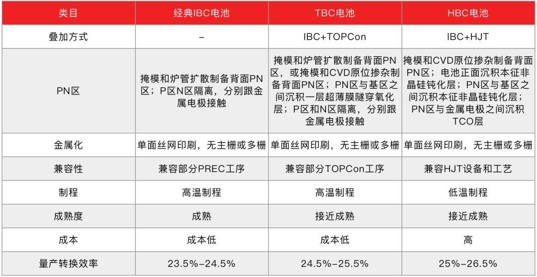 例如:“BC+PERC”转换效率可以提升到24%-25%;融合TOPCON钝化接触技术,演变成的TBC电池,转换效率能到25%-26%;吸收HJT的非晶硅钝化技术,演变成HBC电池,转换效率能到26%-27%。