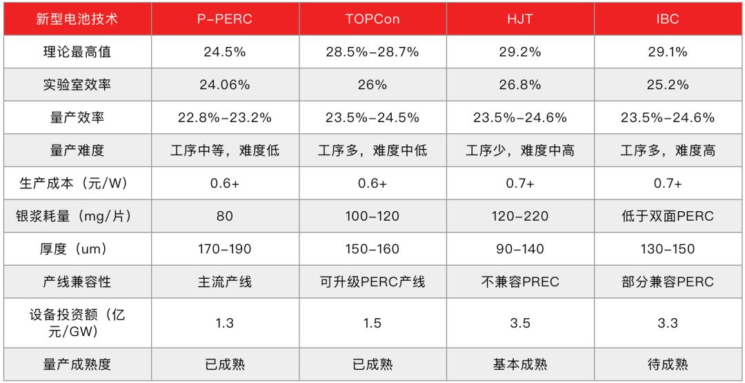 众所周知,光伏电池是决定组件效率和成本的核心器件,也是产业链中最具技术含量的环节。当前P型PERC电池效率平均23%以上迫近其瓶颈,且电池环节盈利能力较差,受替代性技术路线驱动,光伏电池眼下正处于由P型向N型迭代的关键时期。虽然有专家预测PERC电池在2025年仍将保持50%以上的市场份额,但凭借性价比和转换效率优势,快速扩张的TOPCon已经与P型电池的产能相当。