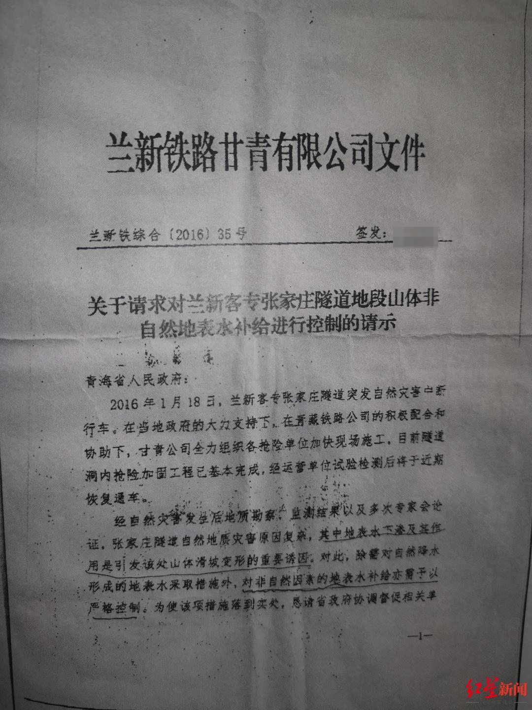 2016年4月,即张家庄隧道首次发生地质灾害三个月后,甘青公司向青海省人民政府发送了一份《关于请求对兰新客专张家庄隧道地段山体非自然地表水补给进行控制的请示》(兰新铁综合【2016】35号)的函。