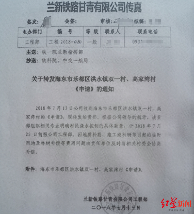 红星新闻记者掌握的一份甘青公司传真文件显示,2018年7月13日,兰新铁路甘青有限公司工程部向铁一院兰新指挥部等单位,转发了双一村、高家湾村此前另一份与其诉求相近的《申请》。