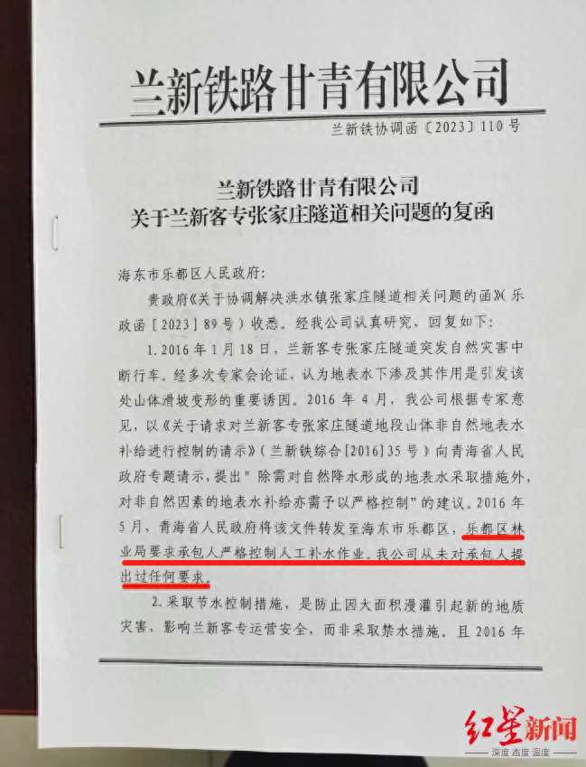 该函显示,“为使该项措施落到实处”,甘青公司恳请青海省人民政府督促相关单位“严格控制张家庄隧道地段山体非自然地表水补给及利于地表水下渗的活动”,为隧道处山体保持稳定创造条件。