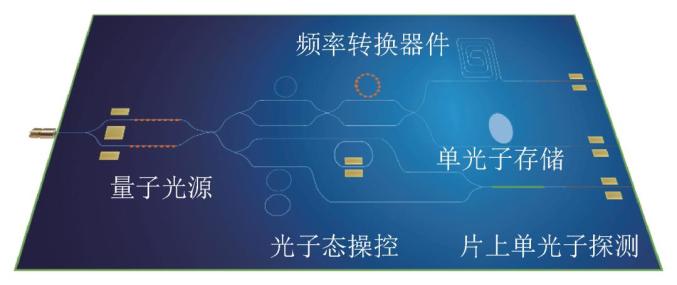 为了实现这一目标,人们发展了以硅、氧化硅、氮化硅、铌酸锂等材料为衬底的光量子集成技术,演示了具有不同功能的光量子集成器件及芯片[1,2]。其中铌酸锂材料具有透明波段宽、吸收损耗低、抗光学损伤阈值高等特点,尤其是同时具有很高的非线性光学、电光、声光、热光系数,在经典光学研究中就已经被认为是理想的光子集成衬底材料[3,4]。经过数十年的发展,人们已经掌握了一系列基于铌酸锂的微加工技术,能够基于准相位匹配原理和畴工程技术设计制备光学超晶格等人工微结构材料[5];通过钛扩散、质子交换等技术加工低损耗的光学波导[6];近年来人们又基于智能剥离技术研发了铌酸锂薄膜和相关器件的加工工艺,大大缩小了铌酸锂功能器件的体积,使大规模铌酸锂光子集成成为可能[7,8]。目前铌酸锂集成器件已经能够实现高效率光学频率转换[9,10]、高速低功耗电光调制[11]、声光调制[12]、高性能射频滤波[13]、微腔光学频率梳产生[14]等功能集成。为此,美国哈佛大学发表了题为“Now entering,Lithium Niobate Valley”的报道[15],指出:“铌酸锂材料对于光子学的意义,等同于硅材料对于电子学的意义。”铌酸锂集成器件不仅大大推动了经典集成光学技术的发展,对于光量子集成也具有重要意义[16,17],它极大地丰富了量子集成器件的“工具箱”,可以实现高码率量子光源产生、高速高保真度光子态操控、高效率单光子频率转换等功能,并有望实现全集成的光子频率态操控、确定性多光子态产生、光子态存储和探测,为全集成的有源光量子芯片提供了一种可能的方案,如图1所示。