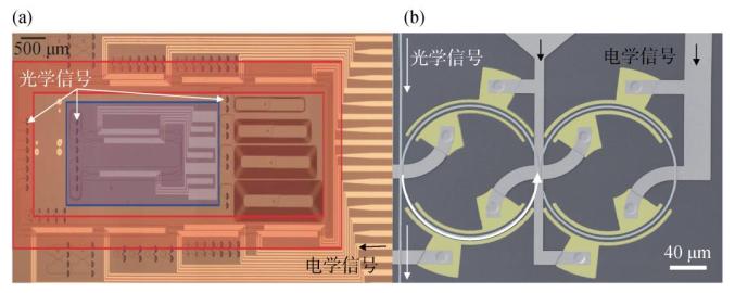 图3 铌酸锂基片上单光子操控器件 (a)基于铌酸锂薄膜的可编程量子干涉仪[35];(b)可用于频率编码光子态操控的铌酸锂集成电光调制频率分束器[9]