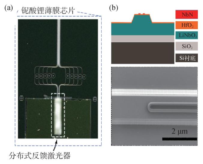 图6 铌酸锂基异质集成器件 (a)异质集成的铌酸锂基窄线宽激光器[52];(b)铌酸锂基单光子探测器[56],其中上图为NbN与铌酸锂薄膜的异质集成结构示意图,下图为器件电镜图