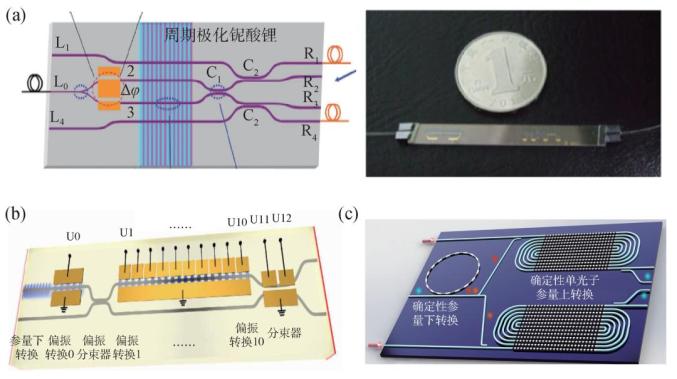 图7 铌酸锂基光量子集成芯片 (a)首个铌酸锂有源集成光量子芯片[25],其中左图为芯片示意图,右图为实物照片;(b)铌酸锂基偏振及时间控制芯片[34];(c)基于铌酸锂薄膜的确定性单光子相互作用方案[60]