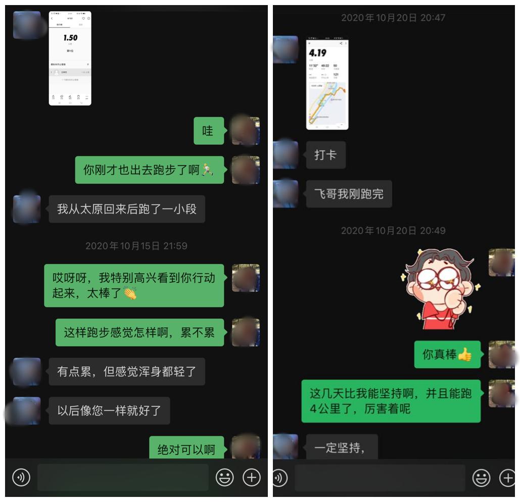 同学们的鼓励也为小杰灌注着信心。虽然一开始不太好意思,但是小杰开始在同学群里活跃起来,晒出自己的跑步日常。同学们在群里给了他许多积极的回应,为他加油。