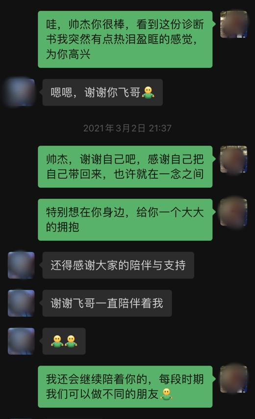 每天聊天,互相打卡,就这样度过了四个月时光。小杰始终在积极配合治疗,每次去复查,只要病情有好转,他都会第一时间告诉这个比自己大二十多岁的“跑友”。