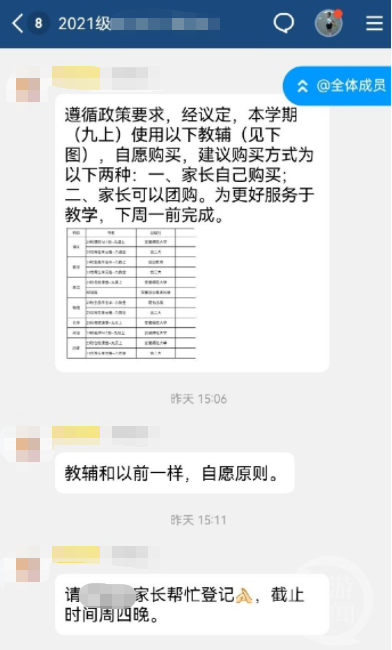 记者看到,在网友发出的相关家长聊天群的截图中,46中南校区2021级某班的班主任要求“根据本学期课程需求,需使用以下教辅(记者注:如下图),遵循政策要求自愿购买”。