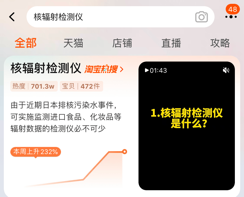 上周,核辐射检测仪一直盘踞淘宝热搜榜,热度飙升232%,百度指数更是同比飙升1671%。