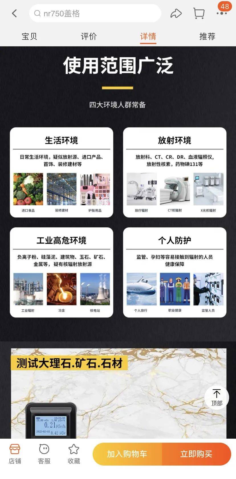 目前电商平台热销的核辐射检测仪的价格在100至400元之间,以盖革计数器为主,声称可以检测化妆品、海鲜、首饰、装修建材等生活环境里的核辐射,甚至可以检测工业环境里的300多种气体。