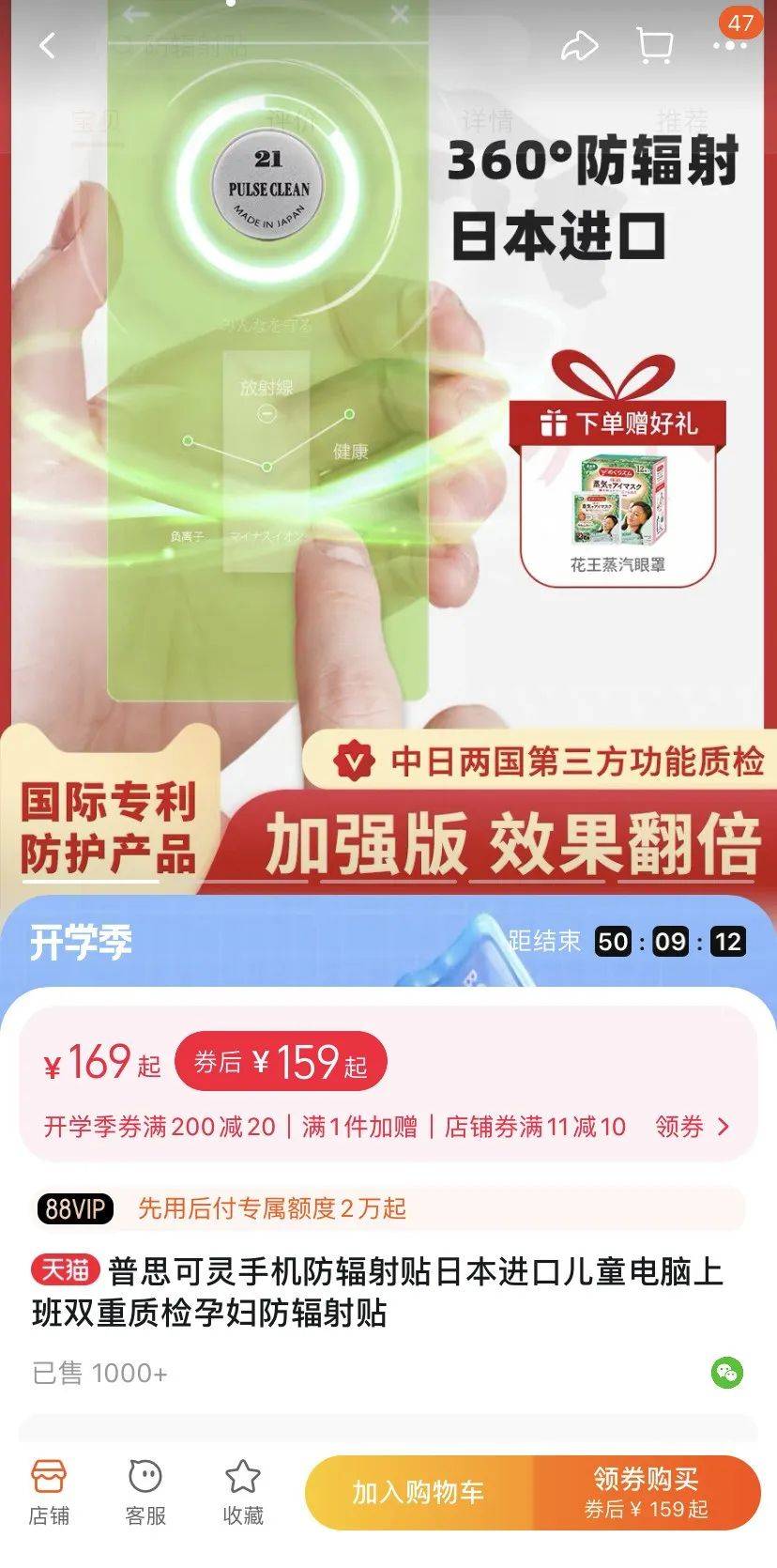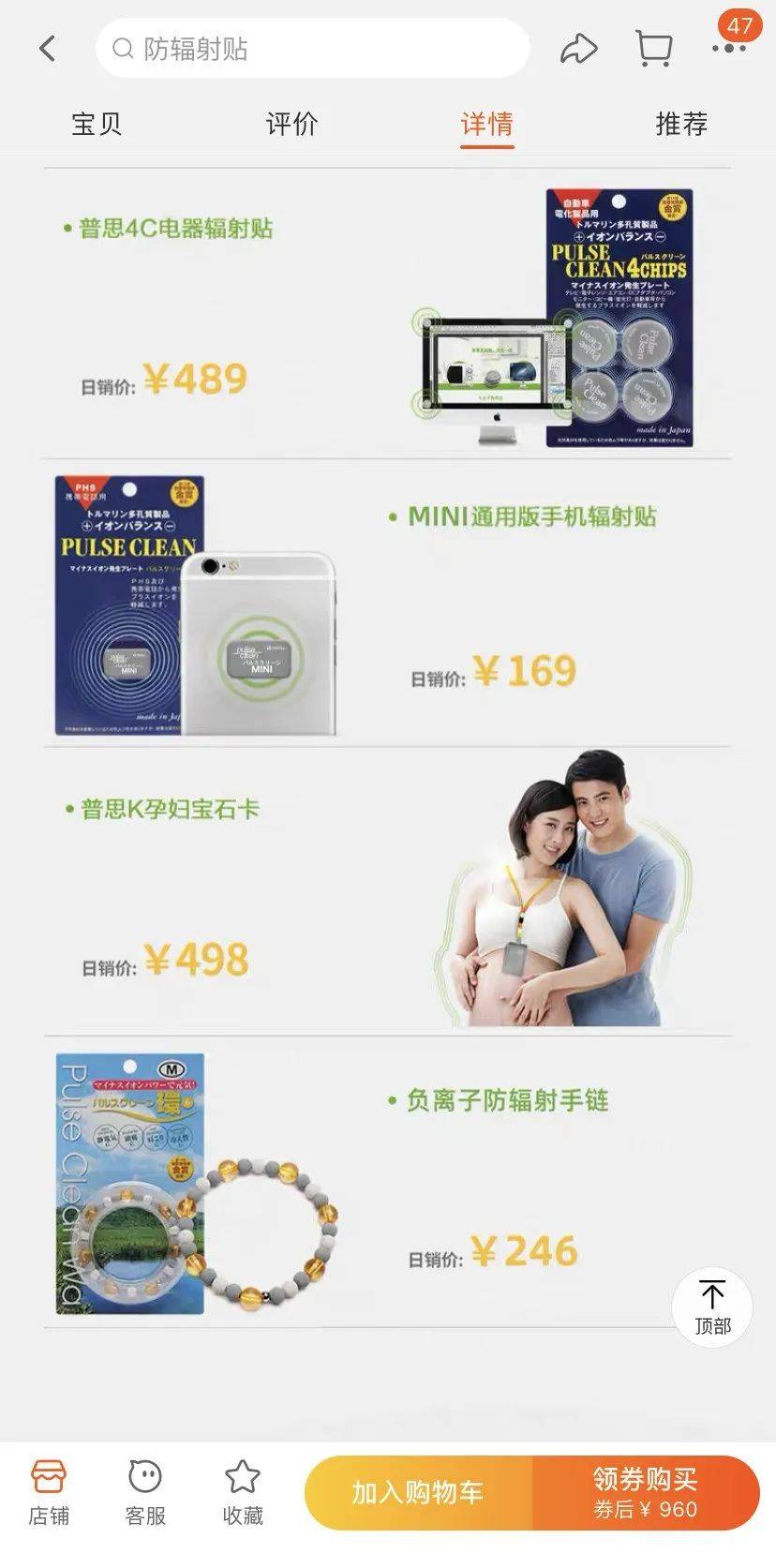 如今,这类防辐射产品形态已从贴纸衍生到吊坠、项圈、手链等,价格从5元上升到1000元左右的“防辐射几件套礼盒”,打上孕妇、婴幼儿、特殊工种等敏感人群的标签。