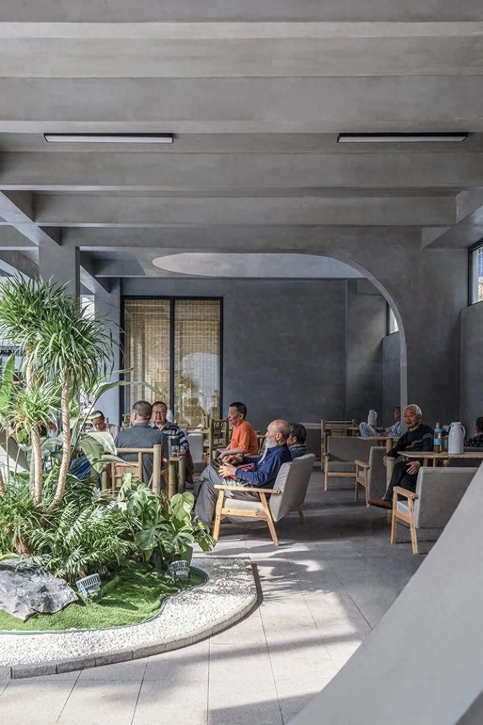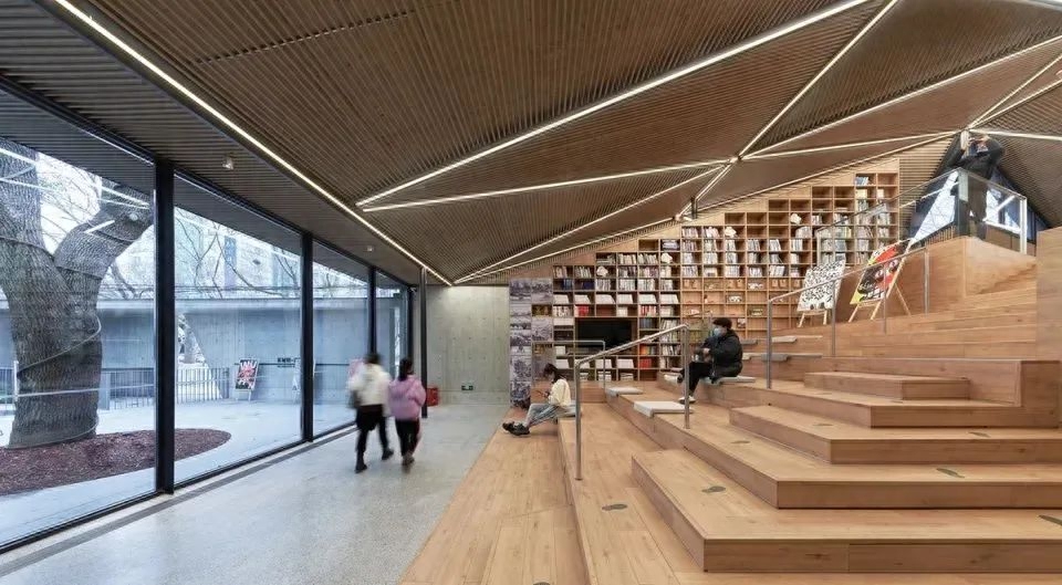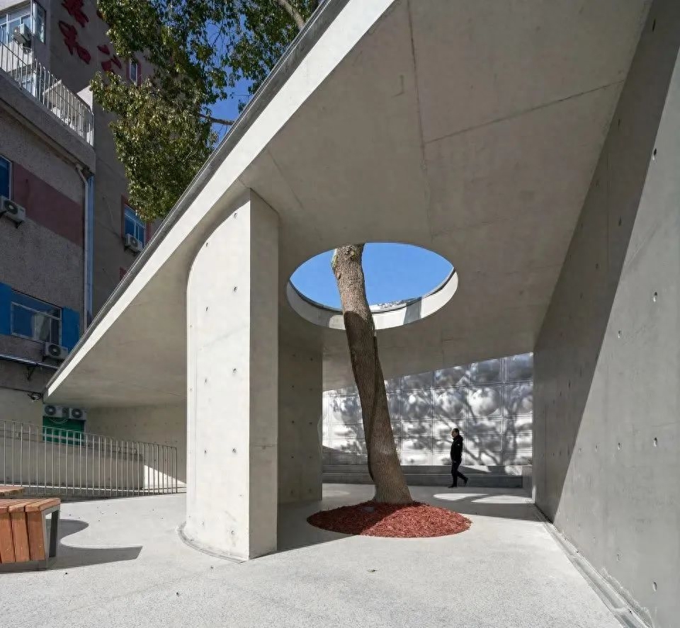 通过环绕的坡道和楼梯,进入的屋顶露台是第一个停留空间,可以在享受树荫下纳凉的安全舒适同时,俯瞰墙外中山路的车水马龙。进入北侧庭院长长的坡道会成为附近社区小朋友最喜欢的地方,庭院以浅水景为主景,保证儿童嬉戏时的安全。