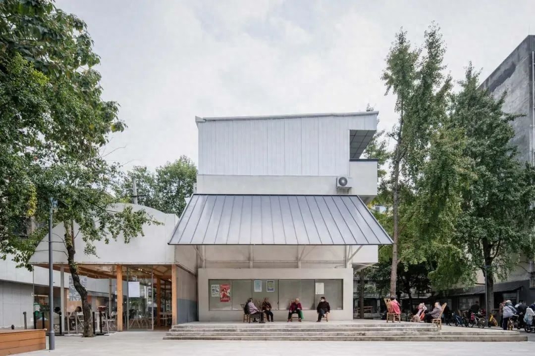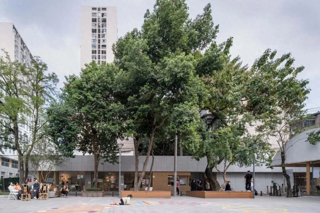 场地最大的特征是无序、边界模糊,以及四颗枝繁叶茂的香樟。项目的目标是重新利用场地,创造活跃的社区活动空间和满足公共卫生间要求。建筑以“大树底下好乘凉”的姿态介入场地的复杂环境,在不规则的场地上建立起三个院子来保留四颗香樟,限定边界,整个屋面都趴在树荫底下。