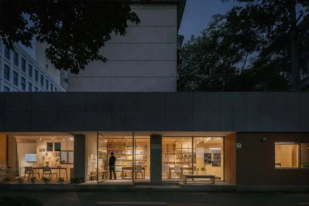 在临街院墙后嵌入了一个白盒子,把院门对应的区域抽空形成前院,组织起咖啡厅和书屋的入口空间。嵌入室内的部分让原本单薄的围墙不再是表皮,而成为狭窄但有深度的腔体,窗口更加生动,院内与街面有了交流的可能,也成为咖啡厅的空间特征。