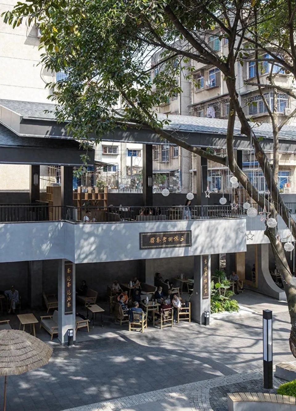 将人行动线尽量靠近内院边缘来设置,再借助院内保留的三颗大树将院子一分为二:前院可听戏、纳凉、办理事务,后院中来聊天、议事、读书、喝茶。通过空间的分隔将功能进行分区,人们在院内行进也会更有方向感。