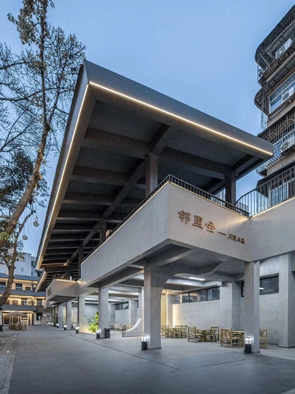 建筑造型由一层薄薄的白色铝板面经过两三次折转构成入口门道空间,顶视就像一把转折的曲尺,把各类人群都保护含纳在其下;再配合以仿木色的铝方通格栅,在引导行人通行的同时将一些消极元素(如食堂风管)隔挡在外,也为所有进出的老幼居民、快递员、上班族等,提供一处可以聚集聊天、稍事歇脚的温馨场所。