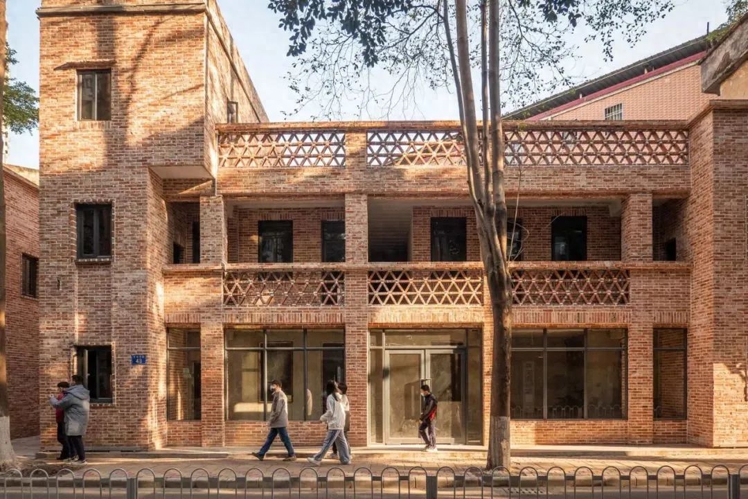 对场地部分带有岭南特色的民居进行保护修缮,对周边违建加建建筑进行拆除或改造,重现历史空间的完整性和连续性。社区北部原先面向外部空间的界面因为红砖残旧,过于围蔽显得消极,通过拆除封堵建筑物的围墙,使建筑面向环城西路开放,便人流于通达,我们也在先锋原有的特色砌砖形式上进行新形式的改变,使红砖建筑更具魅力。