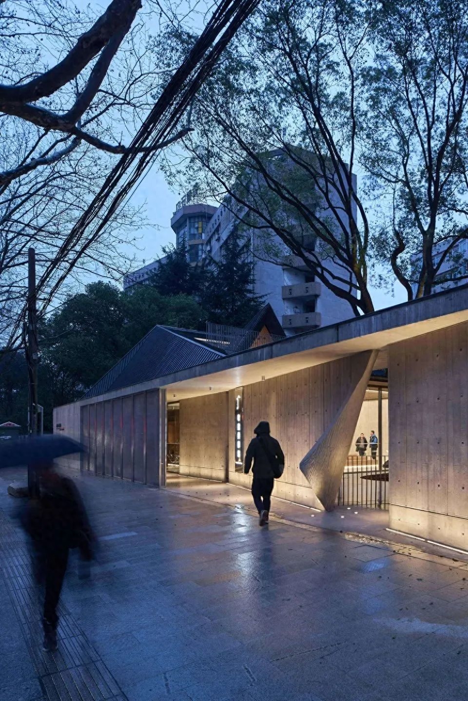 围绕建筑空间和庭院置入由楼梯和坡道构成的立体流线,吸引公众参与其中。在沿街面用厚重的木纹混凝土和轻盈的金属网去迎接公众视线,当访客接近时,混凝土卷起的入口勾起访客一探究竟的好奇心,引导访客进入预设的行走流线。