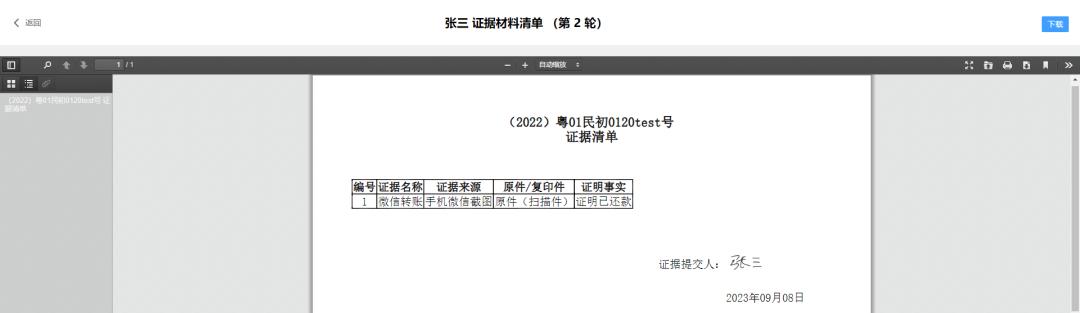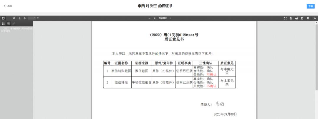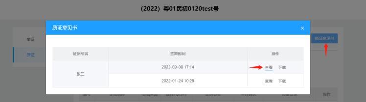 签名并提交质证意见后,在质证列表就能看到签名的质证意见书。