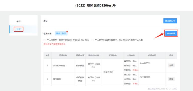 在一方当事人完成举证后,法官可将相关证据推送至其他当事人。其他当事人收到短信后,即可登录系统,选择质证界面,对提交证据材料的真实性、合法性和关联性进行确认,注意要在质证截止时间前完成质证。