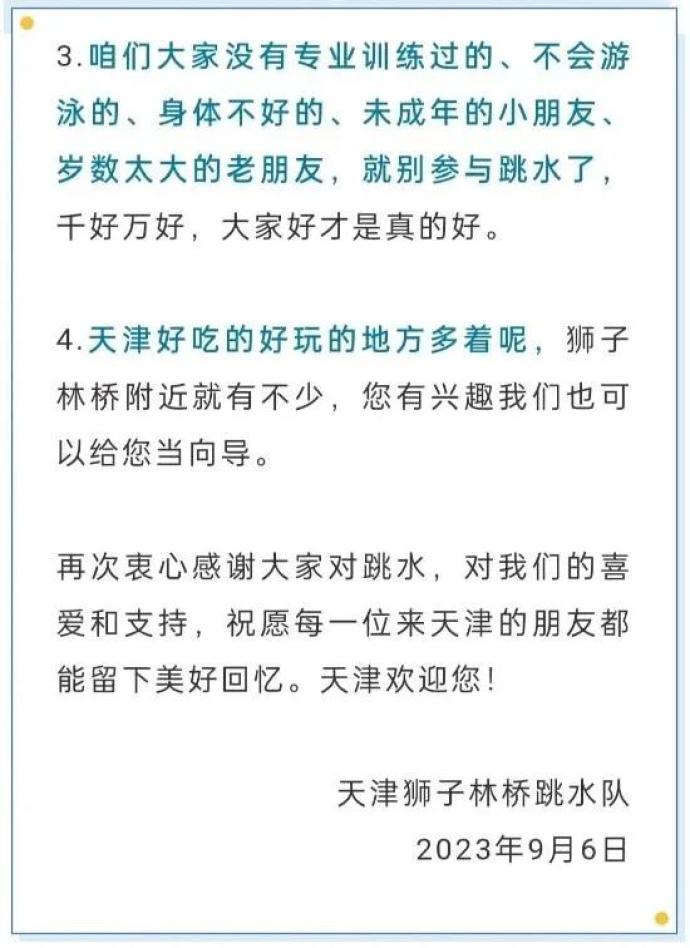 梳理相关报道可知,从8月下旬起,狮子林桥所属的街道办事处、派出所以及天津水务局都相继发声表示,根据《天津市文明行为促进条例》,海河禁止跳水和游泳。相关人员还给出进一步解释,海河上常有船只经过,其水下情况也比较复杂,这些都可能对涉水者的人身安全造成威胁。
