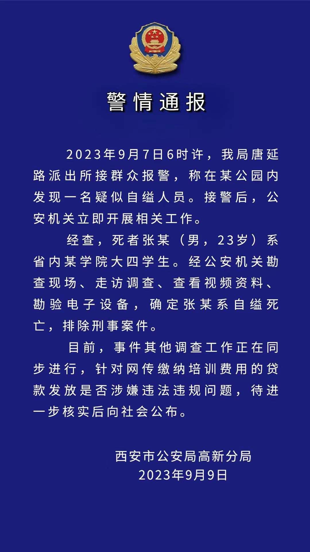 9月9日,西安高新警方发布警情通报,确定学生是自缢死亡,排除刑事案件。