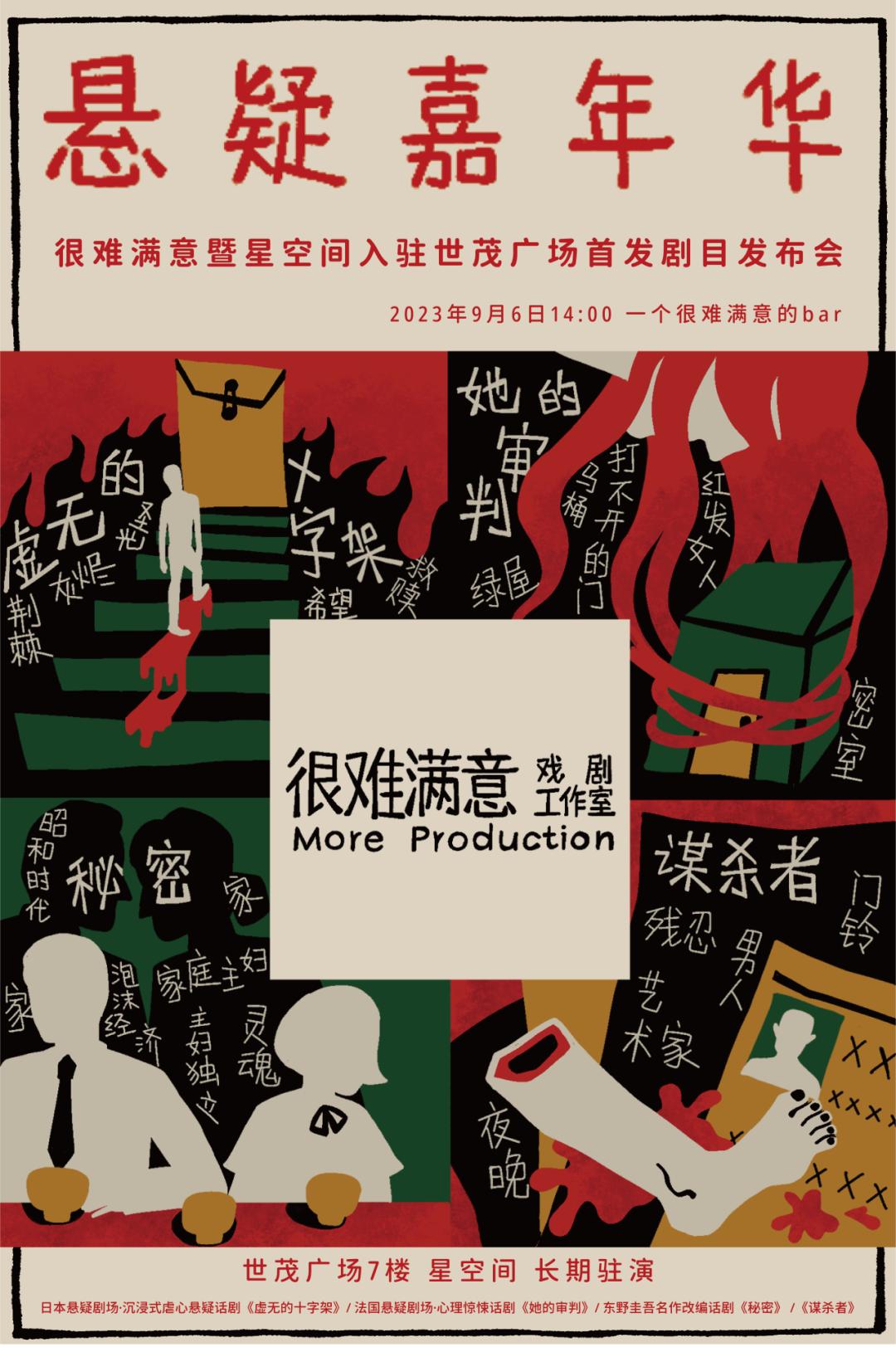 很难满意戏剧工作室将在世茂广场打造一个以悬疑推理为主题,以话剧演出为主要艺术类别,统一运营、统一管理的星空间群落新模式,打造更具主题性、针对性的演出业态。10月起,“悬疑嘉年华”首期将为观众带来一场精彩绝伦的沉浸式悬疑话剧体验,包括来自法国、英国、日本等不同国家的四部风格各异的剧目:《虚无的十字架》《她的审判》《秘密》和《谋杀者》。其中,《虚无的十字架》和《秘密》均改编自东野圭吾的经典同名小说,而《她的审判》则源自百老汇的经典悬疑剧目,原作被改编为多部热门电影,包括《消失的她》和前苏联电影《为单身汉设下的陷阱》。《谋杀者》则是托尼奖得主安东尼·谢弗的经典侦探悬疑作品。这四部剧目都是改编自优质IP和经典剧本,每个剧目都有自己独特的舞台打造,它们将带领观众领略“悬疑世界地图”,沉浸式打卡各国精妙悬疑之作。