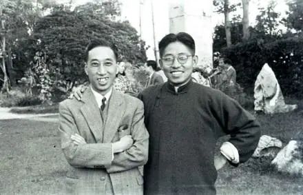 作家柯灵和画家丁聪,他俩身后张爱玲与冯亦代正在交谈。1943年夏天,上海已成沦陷区,柯灵刚受聘接手商业性杂志《万象》,正在寻求作家的支持,他偶尔翻阅杂志《紫罗兰》,读到张爱玲的《沉香屑·第一炉香》,就想找她写稿。
