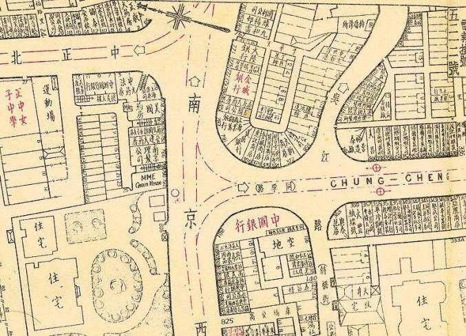图中半圆形标注“中国银行”的便是同孚大楼中国银行早在二十世纪二十年代即于上海金融区的外滩建造一座与其地位相称的银行大楼(现中山东一路23号)。在上海市区仅分行一个营业单位,无分支机构。后来随着业务的发展,市内网点的建立,员工的增加,又分别在市中心和西区购进地皮,建造办事处和营业用房,仓库和员工宿舍。在1930年6月和8月分别购进同孚路(现南京西路石门一路)基地房屋和海宁路(现四川北路海宁路口)地段地皮。