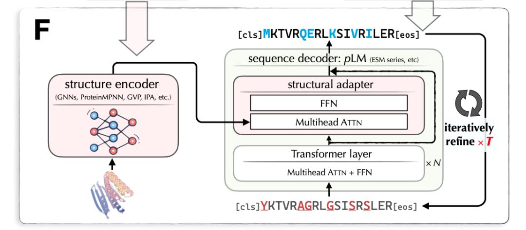 LM-Design 的输入是蛋白质结构,输出是对应的蛋白质序列。LM-Design 由结构编码器和序列解码器组成。其中,结构编码器是已训练好的表示蛋白质结构的图神经网络;序列解码器基于已预训练好的大规模蛋白质语言模型(Protein Language Model),与 BERT/Transformer Encoder 相似(使用双向自注意力),在最后一层插入一个结构适配器(Structural Adaptor)。结构适配器的参数是待学习的。图 7 给出 LM-Design 的模型架构。