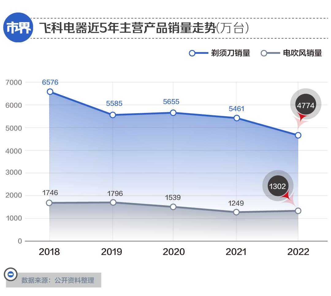 其实,飞科电器的发展也并非一帆风顺,2017年开始经历过一次业绩危机。当时中国剃须刀市场逐渐走向饱和,2018年飞科电动剃须刀销量就已达6576万台,占据市场份额近45%,但从2019年起却不增反降,在5500万台左右徘徊,市占率也降至2022年的不到35%。