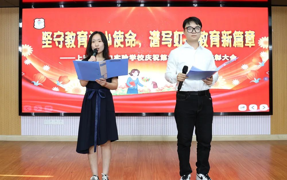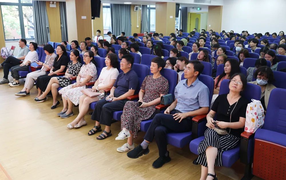 学校邯郸路校区小礼堂内,中小学部教师欢聚在一起参加2023年教师节庆祝表彰活动。