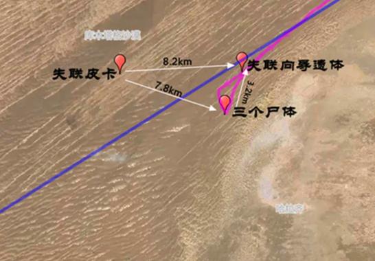 沙漠中的脚印,会被一场风沙掩盖。刘杰推测,贾小宁可能是25日白天弃车出走,朝出口方向去找救援。26日白天,久等不到,车上三人同时弃车。一开始,三人的方向和贾小宁一致。但在一个地点,三人拐了一个接近90度的弯,自此偏离了贾小宁的方向。那个地点,恰好横亘着几座沙山,他们越走越远,最终与贾小宁相差3.2公里。