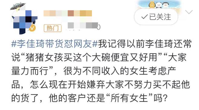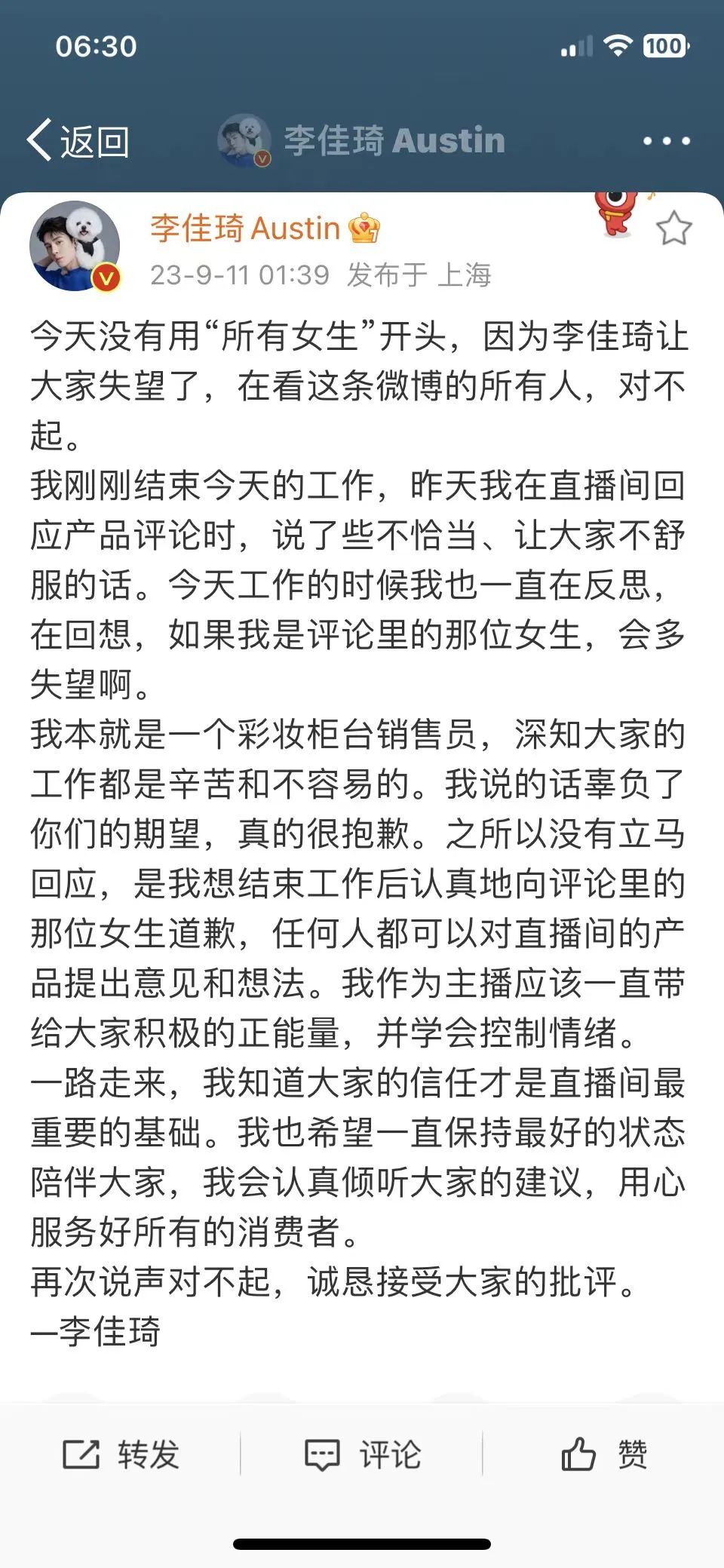 今天没有用“所有女生”开头,因为李佳琦让大家失望了,在看这条微博的所有人,对不起。