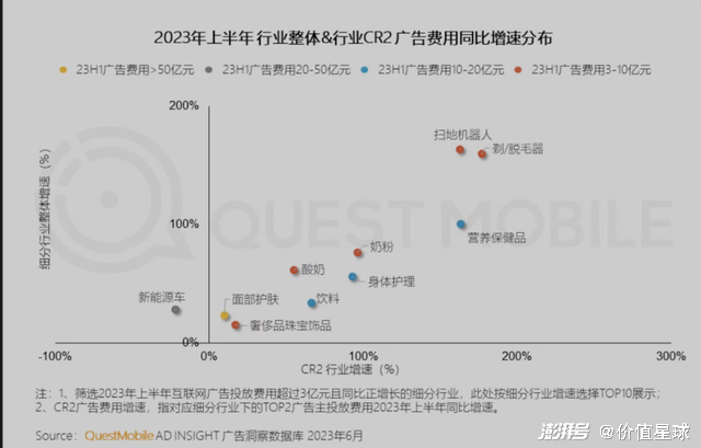 据QuestMobile报告,2023年上半年,脱毛仪广告投放费已经达到了3至10亿元的水平,且行业广告投入增速接近200%,超过酸奶、奢侈品珠宝,成为快消品中当之无愧的“广告王”。