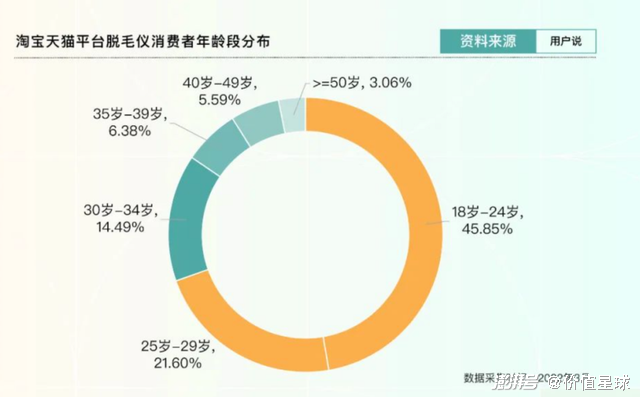 据国货研究院报告,在淘宝、天猫平台上,超过66%的脱毛仪消费年龄在18至29岁之间,且45.85%消费者集中在18至24岁。