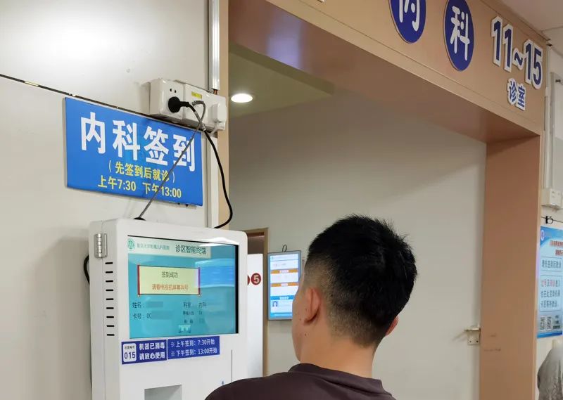一名刚挂号的家长在就诊签到机上刷卡后显示,等候人数为53人。