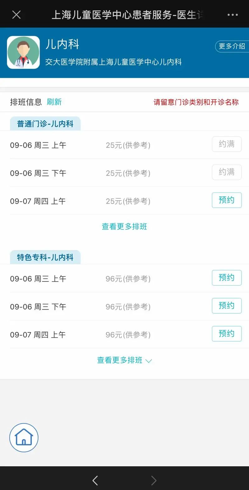 记者9月5日下午尝试预约挂号儿童医学中心9月6日的儿内科时,页面已显示上午下午均“约满”。