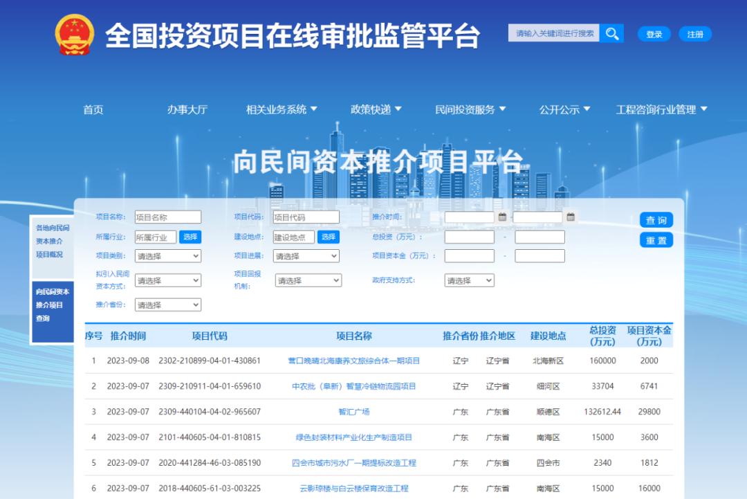 9月8日,为落实党中央、国务院决策部署,进一步激发民间投资活力,做好民间资本项目推介工作,根据《关于进一步抓好抓实民间投资工作 努力调动民间投资积极性的通知》(发改投资〔2023〕1004号)等要求,国家发展改革委通过统一的向民间资本推介项目平台,集中发布了一批重点项目,积极吸引民间资本参与。(网址:http://mjtz.tzxm.gov.cn)
