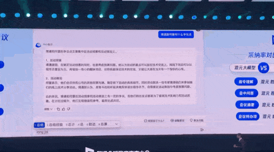 以腾讯会议为例,一场会议一般持续几十分钟到几个小时,会涉及上万个文字,大量口语化的表达,如果参会时稍有走神,可以直接问AI小助手,刚才某位发言人说了什么,如果听到不理解的词,也可以直接询问,而助手不仅会回答这个词的意思,还会回答这个词在会议中出现的场合。会议结束后,所有会议内容可以直接由助手生成一个“to-do”待办,谁在什么时间应该完成什么事情,相当实用。