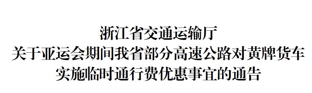为减少杭州第19届亚运会期间临时交通管理措施对货运车辆通行的影响,经省政府同意,现就亚运会期间我省部分高速公路对黄牌货车实施临时通行费优惠事宜通告如下:自9月15日0时至10月9日24时止 ,对通行S43杭州绕城西复线、G60沪昆高速、S26诸永高速、S24绍诸高速、G1522常台高速、S12申嘉湖高速、S13练杭高速合围圈高速公路(不含圈内高速公路)的黄牌货车(即2类至6类货车),按现行收费标准的 50%收取车辆通行费。