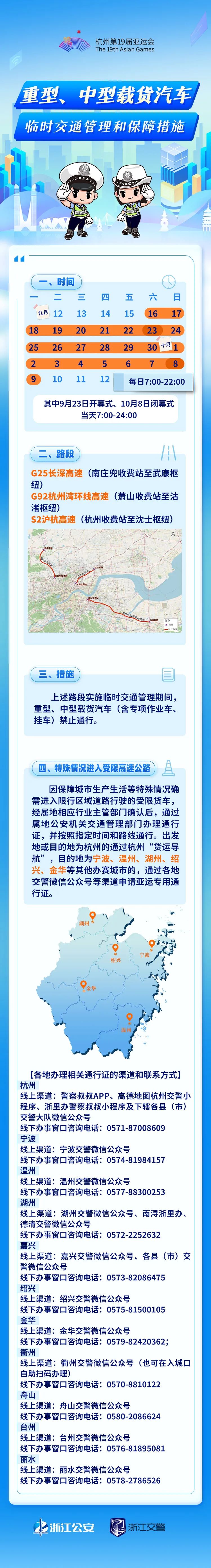 为缓解中秋、国庆假期带来的大流量压力,确保安全、顺畅、有序的道路交通环境,亚运会期间浙江公安交通管理部门将在G25长深高速南庄兜收费站至武康枢纽、G92杭州湾环线高速萧山收费站至沽渚枢纽、S2沪杭高速杭州收费站至沈士枢纽路段对重型、中型载货汽车(含专项作业车、挂车)分时分段实施交通管理措施。